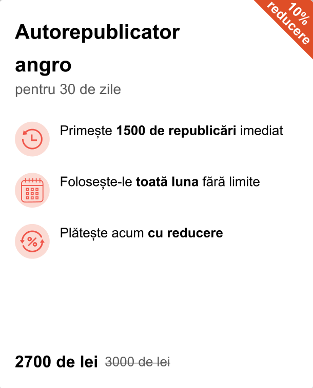 ! Anunțul tău va rămâne în top toată luna fără costuri suplimentare.